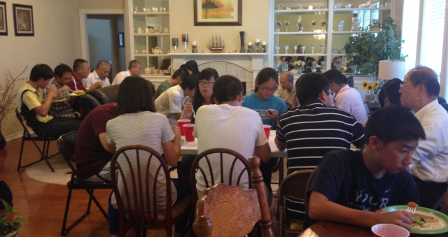 Texas A&M University校园华语基督徒在2014年8月30日在吴弟兄家举办华语真理座谈 既福音聚会。这次的福音行动,源起于春季学期末,白信来弟兄和徐柏玉弟兄来访,与 College Station召会的英、华语负责弟兄、在职服侍圣徒、学生圣徒对校园工作开展的研 讨、交通,并落实了在秋季班开学时, 举办一场华语真理座谈既福音聚会。这次华语福音真理座谈的主要特点是有更多的学生圣徒投入福音行动。我们将福音单张发 给学生圣徒,鼓励他们带他们的朋友或接住新学生,十位福音朋友中有八位是学生圣徒带 的。一位英语圣徒也带来一个福音朋友。还有为这个福音行动,华语和英语圣徒们的持续 的祷告。