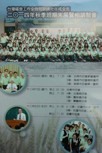 2014台湾秋季壮年班期末展覽相調聚會 已发表 2014-12-25 2014年台湾秋季壮年班94位学员(来自海内外31处教会),分三车访问台南、高雄、屏东、光复、凤林、寿丰、花莲、宜兰等九处教会。 记念所有学员及服事者的灵与魂与身体!使这三队精兵成为当地教会的祝福与荣耀的见证!耶稣是主,基督得胜!