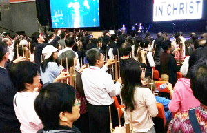 聚會末了印尼的弟兄們還贈送與會聖徒每人一支印尼傳統樂器,並有位年輕聖徒,上臺教我們如何使用。經過簡短的說明練習後,我們一萬二千人開始依著臺上指揮的指示合奏詩歌115首,眾人同心的合奏真是「響亮又諧和」。感謝弟兄們別出心裁的設計,我略略領會到「召會是神美妙詩章」的意義。