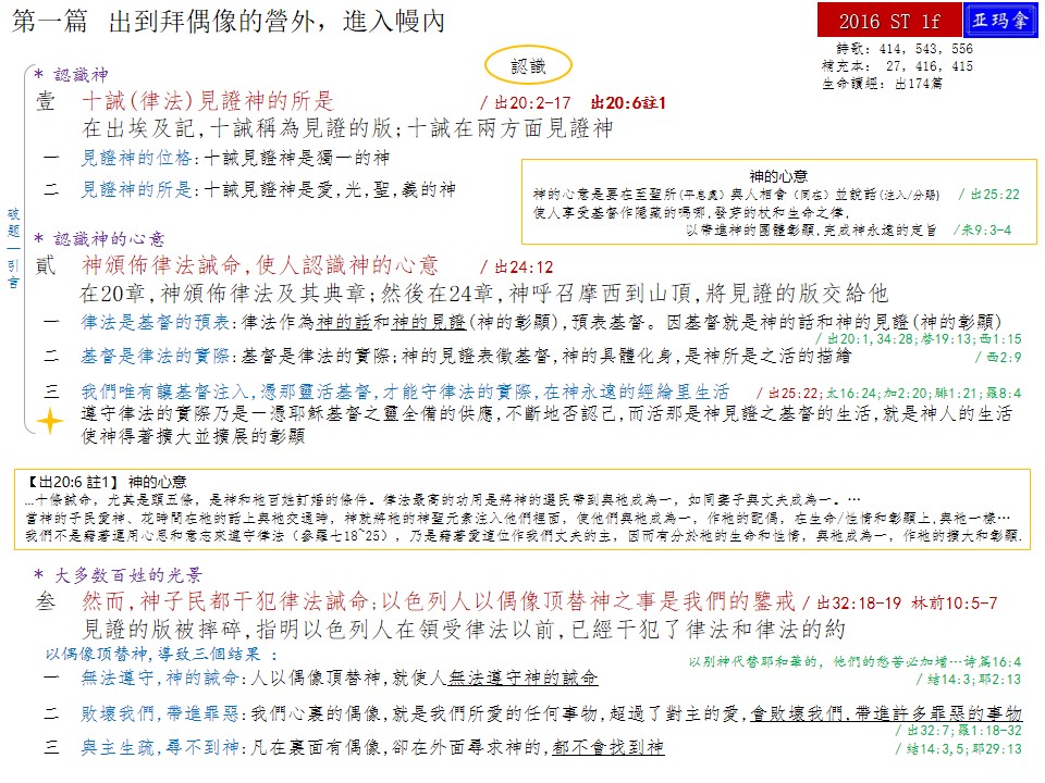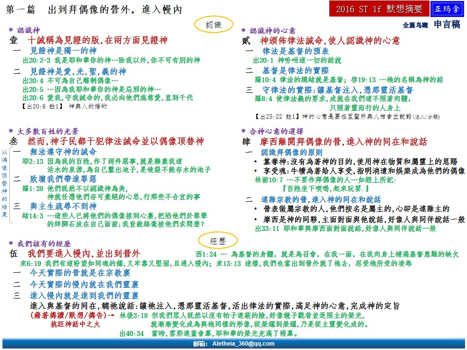 二〇一六年夏季训练第一篇—出到拜偶像的营外,进入幔内 Message One of 2016 Summer Training—Going outside the Idolatrous Camp and Entering within the Veil 已发表 2017-01-19 下载并阅读本篇PDF文档,请点击进入:2016 ST-1f