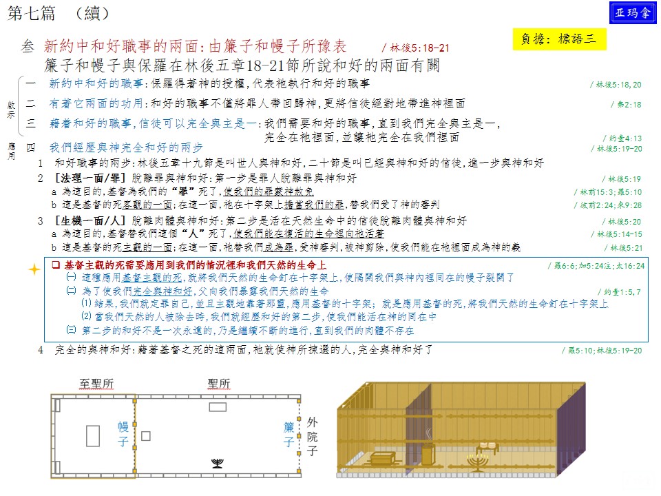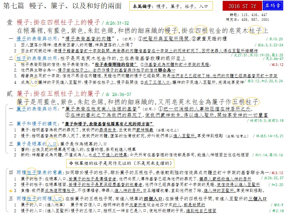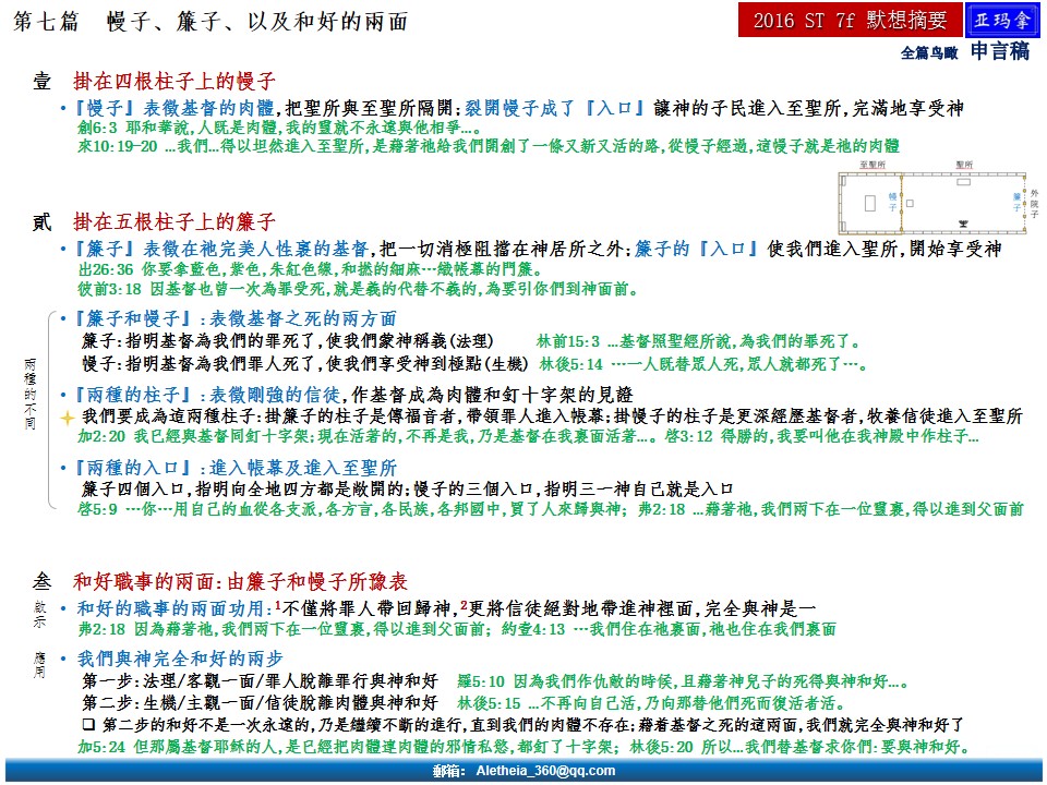 二〇一六年夏季训练第七篇—幔子、帘子、以及和好的两面 Message Seven of 2016 Summer Training—The Veil, the Screen, and the Two Aspects of Reconciliation 已发表 2017-01-20 下载并阅读本篇PDF文档,请点击进入:2016 ST-7f