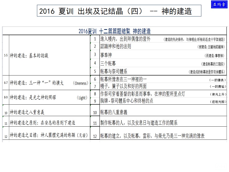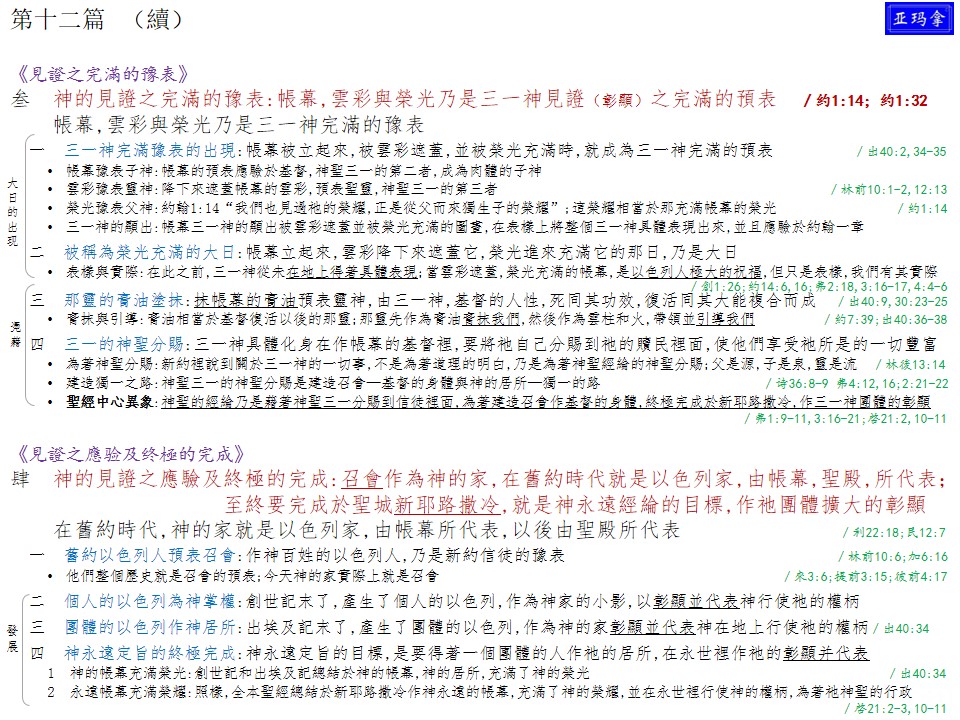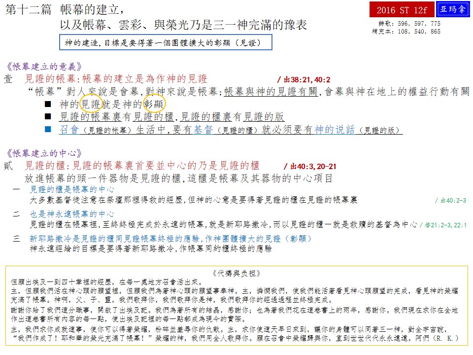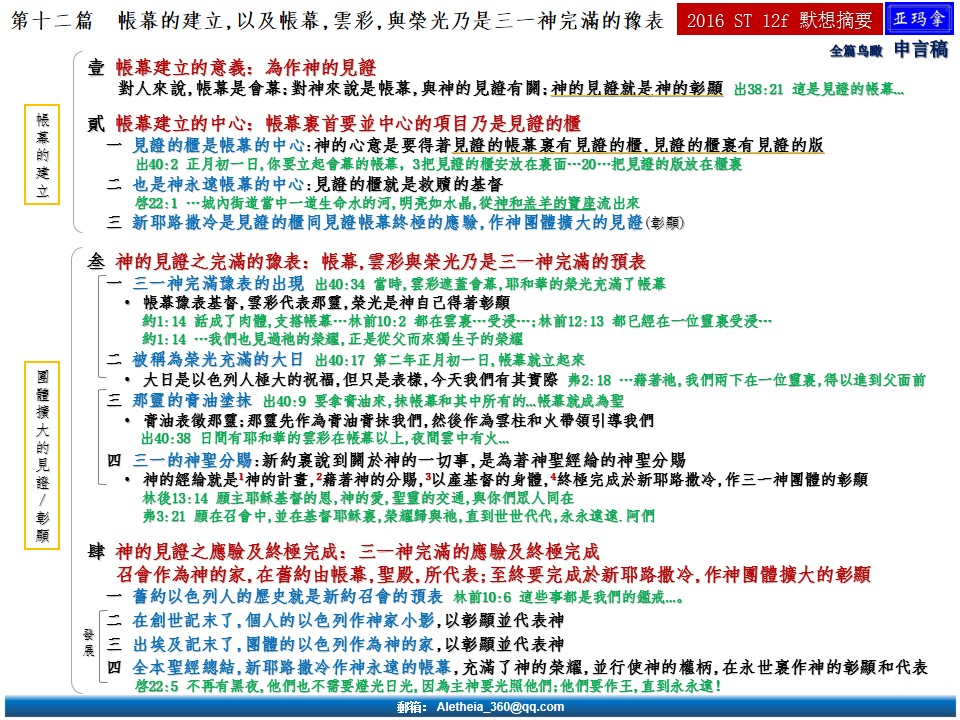 二〇一六年夏季训练第十二篇—帐幕的建立,以及帐幕、云彩、与荣光乃是三一神完满的豫表 Message Twelve of 2016 Summer Training—The Erecting of the Tabernacle and the Tabernacle, the Cloud, and the Glory Being a Full Type of the Triune God 已发表 2017-01-20 下载并阅读本篇PDF文档,请点击进入:2016 ST-12f