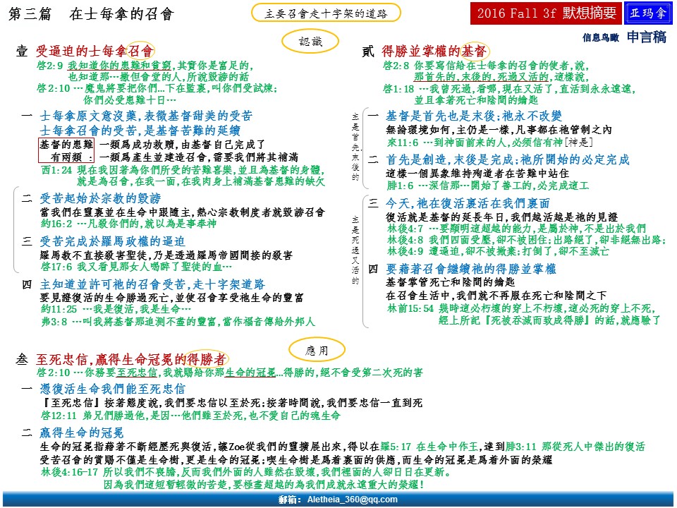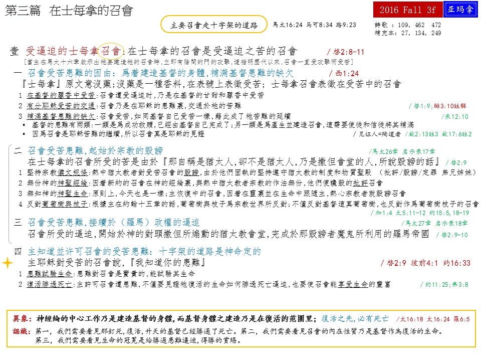 二〇一六年秋季训练第三篇—在士每那的召会 Message Two of 2016 ITERO-Fall—The Church in Smyrna 已发表 2017-01-20 下载并阅读本篇PDF文档,请点击进入:2016 Fall-3f