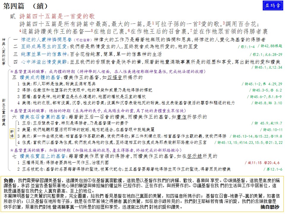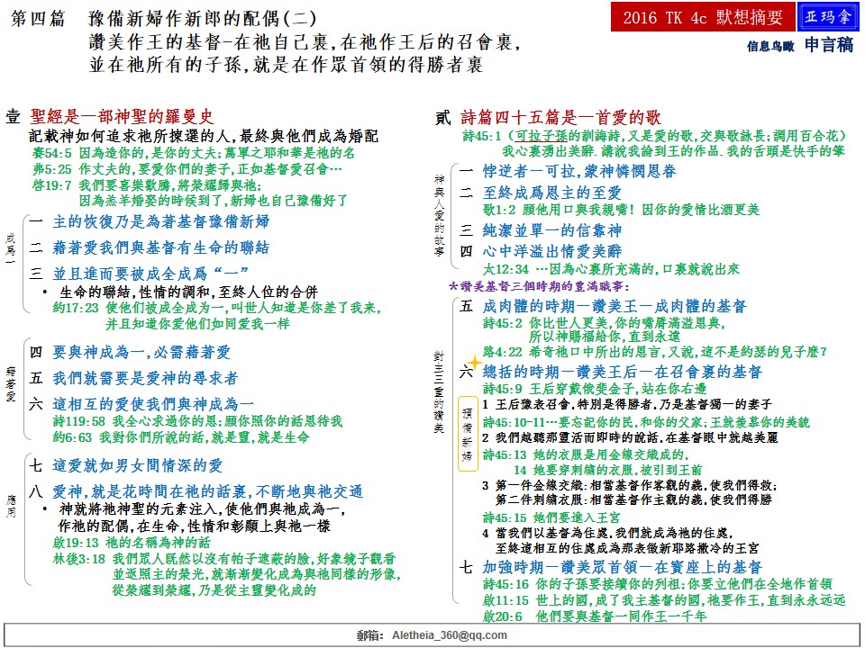 二〇一六年感恩节特会第四篇—预备新妇作新郎的配偶(二)赞美作王的基督─在祂自己里,在作祂王后的召会里,并在祂所有子孙,就是在作众首领的得胜者里 Message Four of 2016 Thanksgiving Conference—To Prepare the Bride as the Counterpart of the Bridegroom (2) Praising Christ as the King in Himself, in the Church as His Queen, and in All His Sons, the Overcomers as the Princes