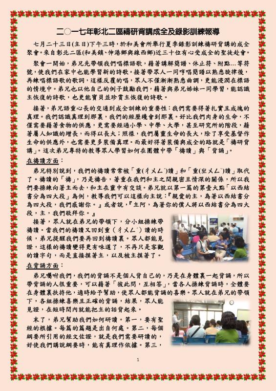 二〇一七年彰北二区祷研背讲成全及录影训练报导 Report on 2017 PSRP Perfecting and Video Training in District 2 of Zhangbei 已发表 2017-07-27