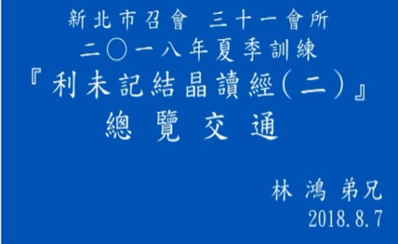 2018 ST 簡要信息要點 總覽交通 2018年夏季訓練『利未記結晶讀經(二)』總覽交通視訊連結網 […] 二〇一八年夏季训练『利未记结晶读经(二)』总览交通 Overview and Fellowship of 2018 Summer Training “Crystallization …
