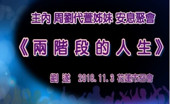 主內 周劉代萱姊妹安息聚會 2018.11.3 花蓮市召會 Source: https://yo […] 【 刘遂「《两阶段的人生》 ─ 主内周刘代萱姊妹安息聚会」】花莲市召会 【 “Two Stages of Life”–Memorial Meeting …