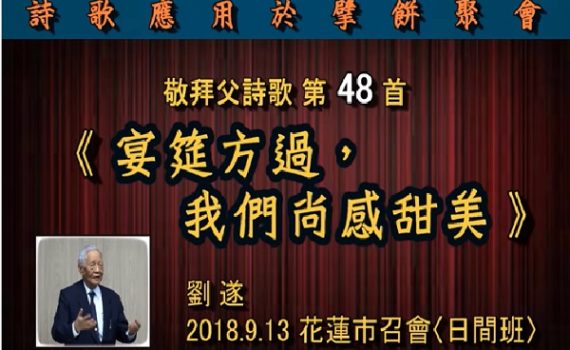 【詩歌應用於擘餅聚會】2018.9.13 花蓮市召會(日間班) Source: https://yo […] 【 刘遂「敬拜父诗歌 第48首《宴筵方过我们尚感甜美》】 花莲市召会(日间班)“Hymn on Worship of the Father-After the …