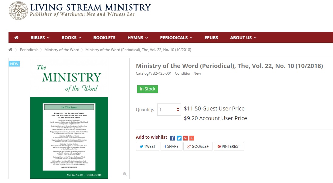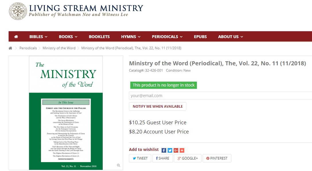 New Releases for November 2018 (Living Stream Ministry) 二〇一八年十一月新出版内容 | 水流职事站 已发表 2018-12-03 Source: https://www.livingstream.com/en/ministry-of-the-word/32425001-ministry-of-the-word-periodical-the-vol-22-no-10-102018.html Source: https://www.livingstream.com/en/ministry-of-the-word/32426001-ministry-of-the-word-periodical-the-vol-22-no-11-112018.html