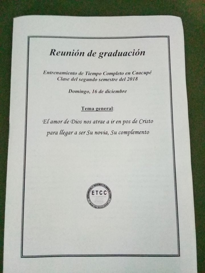 Reunión de graduación ETCC.paraguay ..El amor de Dios nos atrae a ir en pos de Cristo para llegar a ser su novia ,Su complemento…Domingo,16 de diciembre 2018 ..Amen