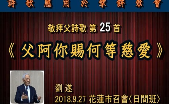 【詩歌應用於擘餅聚會】2018.9.27 花蓮市召會(日間班) Source: https://yo […] 【 刘遂「敬拜父诗歌 第25首《父阿你赐何等慈爱》】花莲市召会(日间班)“Hymn on Worship of the Father-What Love Thou …