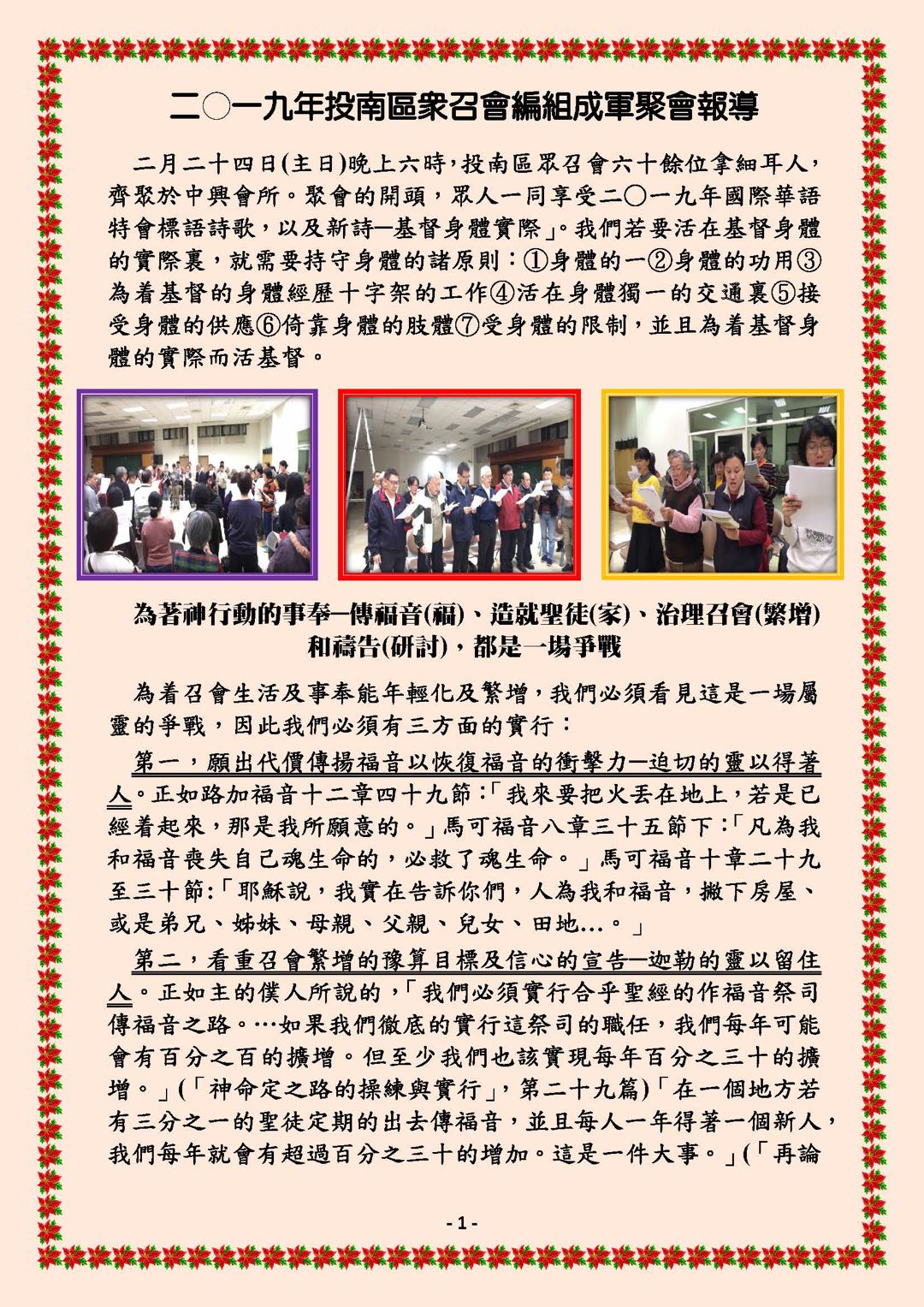 二〇一九年投南区众召会编组成军聚会报导 Report on 2019 Being Formed into An Army Meeting among the Churches in TouNan District 已发表 2019-02-28