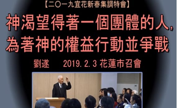 【2019 宜花新春集調特會】2019.2.3 花蓮市召會 Source: https://yout […] 【刘遂『神渴望得着一个团体的人,为着神的权益行动并争战』】花莲市召会 “God Desires a Corporate Man to Journey and Fight …