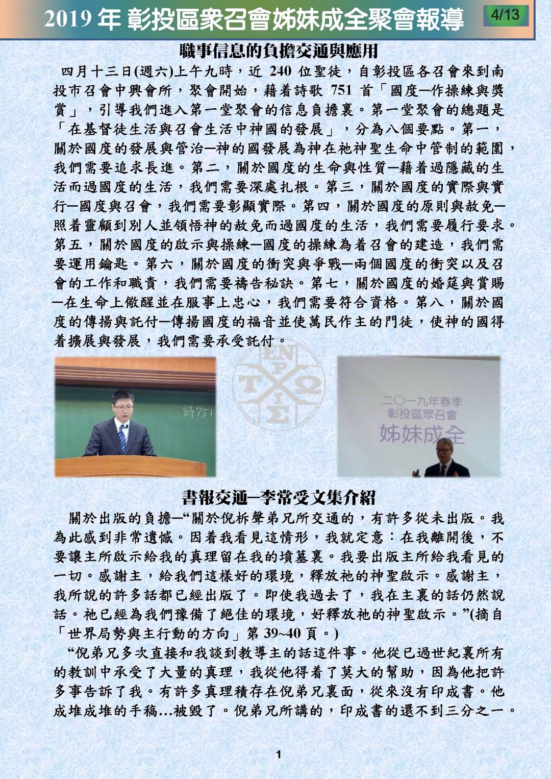 二〇一九年彰投区众召会姊妹成全聚会报导 Report on 2019 Sisters’ Perfecting Meeting | The Churches in Changhua – Nantou 已发表 2019-04-19