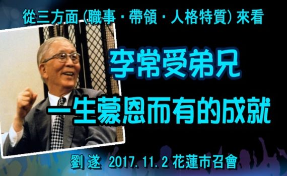 【 劉遂「從三方面來看李常受弟兄一生蒙恩而有的成就」】2017.11.2 花蓮市召會 Source: […] 【 刘遂「从三方面来看李常受弟兄一生蒙恩而有的成就」】花莲市召会【“From Three Aspects to See Brother Witness Lee’s Achievements …