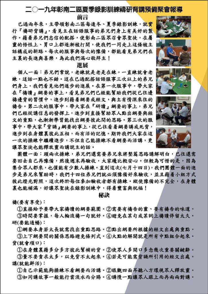 二〇一九年彰南二区夏季录影训练祷研背讲预备聚会报导 Report on 2019 Summer Video Training and PSRP in Changhua and Nantou City 已发表 2019-07-18