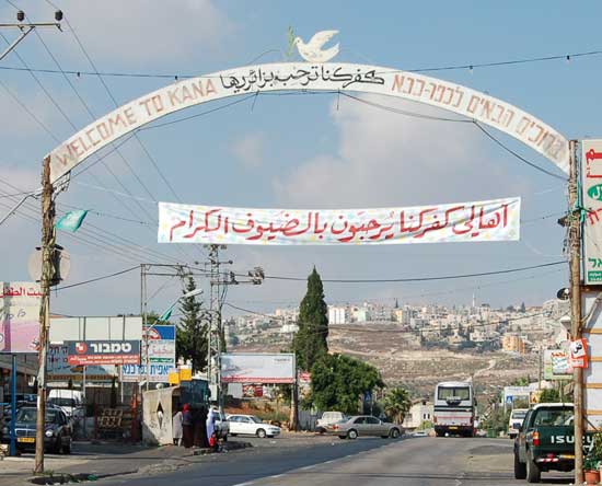 迦拿(Cana, 意芦苇。 芦苇象征软弱、脆弱的人),旧约未曾提及,是拿撒勒和迦百农之间的一个小村庄,在小山和溪水旁,不在干道上,环境清静,目前人口不到两万人。 耶稣在此行了第一个神迹,变水为酒,所以祂的门徒就信入了祂(约2:1-11)。 耶稣在加利利省所行的第二个神迹也在迦拿,医好了大臣的儿子,使这位大臣的全家都信了耶稣(约4:46-54)。 迦拿也是耶稣的门徒拿但业的家乡(约21:2)。