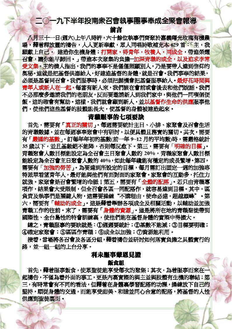 【二〇一九下半年南投区众召会执事团事奉成全聚会报导】【Report on Second Half of 2019 a Body of Deacons’ Service Perfecting Meeting among the Churches in Nantou City】 已发表 2019-09-03