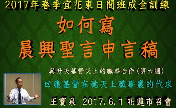 王寶泉「『如何寫晨興聖言申言稿』經驗分享」2017.6.1 花蓮市召會(日間班) Source: h […] 【「如何写晨兴圣言申言稿 」经验分享】【“How to Compose a HWMR Prophecy” Experience Sharing】