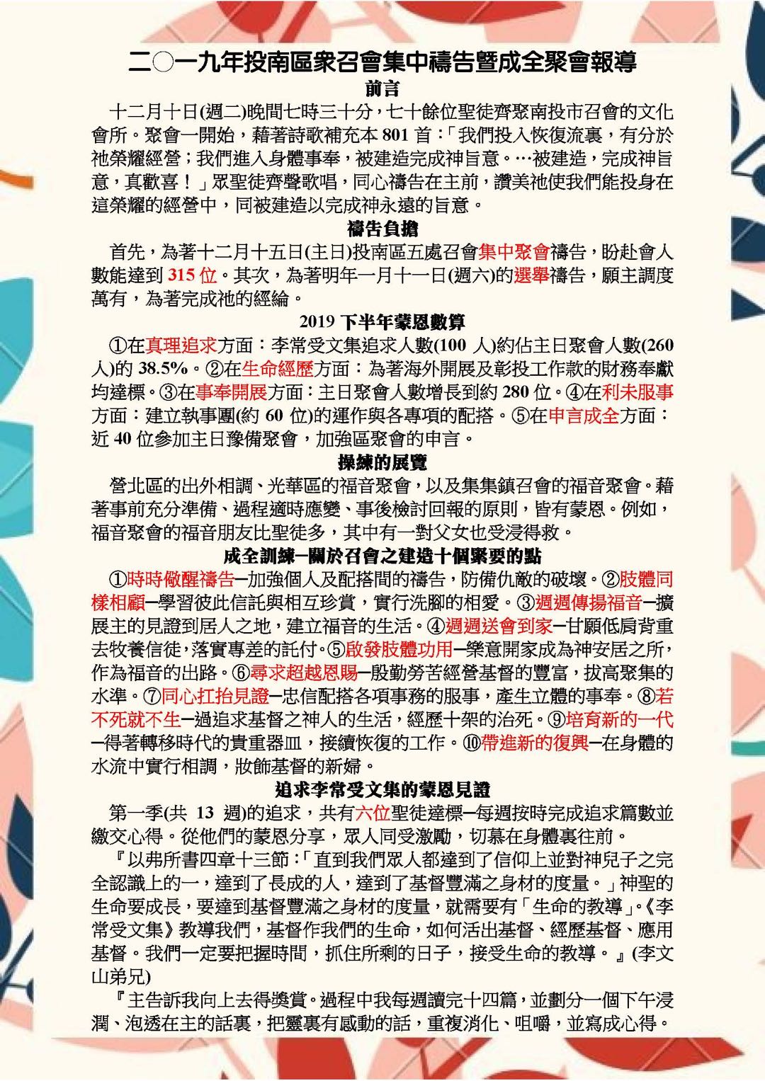 二〇一九年南投市召会集中祷告暨成全聚会报导 Report on 2019 Combined Prayer and Perfecting Meeting in the Churches of Nantou City 已发表 2019-12-14