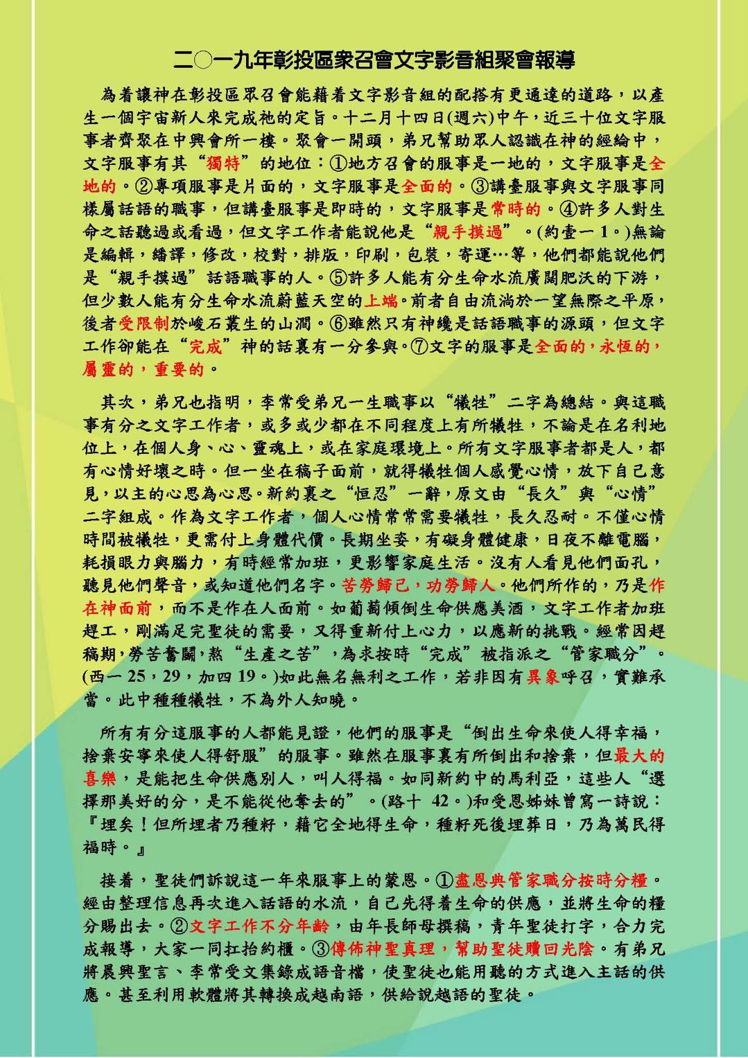 二〇一九年彰投区众召会文字影音组聚会报导 Report on 2019 Literature and Videos Group among the Churches in Changhua-Nantou 已发表 2019-12-16
