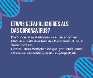 Während sich das Coronavirus weiterhin ausbreitet, werden die Menschen in der ganzen Welt immer ängstlicher und geraten sogar in Panik. Es ist schwierig, das Ausmaß der Auswirkungen dieses Coronavirus vorherzusagen. Die Menschen haben Angst davor, sich mit der Krankheit anzustecken, weil die Möglichkeit besteht, dass sie daran sterben. Es ist aber nur wenigen Menschen bewusst, dass sie in Gottes Augen bereits tot sind. Die Bibel sagt: „Und euch, obwohl ihr tot wart in euren Verfehlungen und Sünden […]“ (Epheser 2:1). Die Menschen haben Angst davor, körperlich krank zu werden und zu sterben, obwohl sie geistlich schon tot sind, da sie mit einem äußerst gefährlichen Virus infiziert sind – der Sünde. Die Sünde ist so stark, dass sie einen enormen Einfluss auf alle drei Teile des Menschen hat: Geist, Seele und Leib.