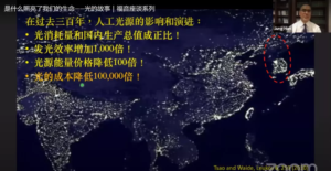 在过去三百年,人工光源的影响和演进:光消耗量和国内生产总值成正比,发光效率增加1000倍,光源能量价格降低100倍,光的成本降低十万倍!那么,人内里的光在哪里呢?我们需要里面的光来照亮我们生命的道路,医治我们各样的情形。这是我们的挑战,我们的机会,也是我们的需要。