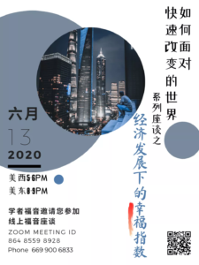 6月13日,美西时间晚上5点-6点,美东时间晚上8点-9点,主讲人埃默里大学教授陈弟兄(Emory University),主题:《经济发展下的幸福指数》。