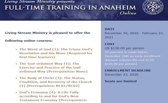 Living Stream Ministry is pleased to offer the fol […] Full-Time Training in Anaheim – Online: New Term 21A