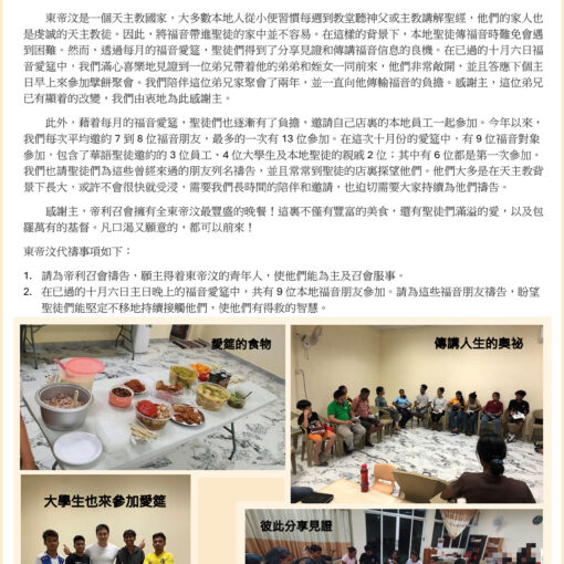 自去年十一月份迄今,每月皆有一次青少年生命教育福音体验活动;一次又一次的活动,不仅破除了青少年及家长对宗教的迷思,也让他们看见原来生命的奇妙─来自这位宇宙的造物主,因而深获大家喜爱。直到目前为止,每月的生命教育福音聚会中,皆有将近二十位青少年及家长参与。为此,我们对主满了感谢与赞美,盼望主更深的制作并带领他们,使他们借着这样的课程来认识这生命的实际─救主基督耶稣。求主赐给他们都有得救的智慧,接受主作他们的生命和一切。