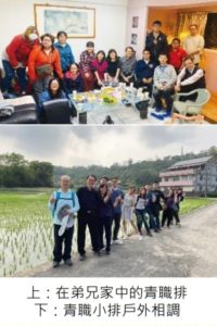 九月之后,因有分中坜后火车站生活圈的福音开展,叩访时遇着一对已得救的母女,刚搬来中坜,人地生疏彷徨无依。如今接触到身体的供应和温暖,从此就稳定加入青职排的聚集。