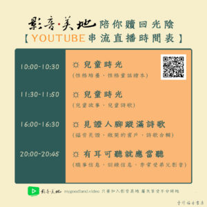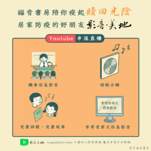 在居家防疫期间,因应各年龄层广大的需求,台湾福音书房从五月二十八日(周五)起提供影音美地Youtube串流直播服事,内容包罗,举凡儿童、福音、牧养及真理等影音材料,应有尽有。