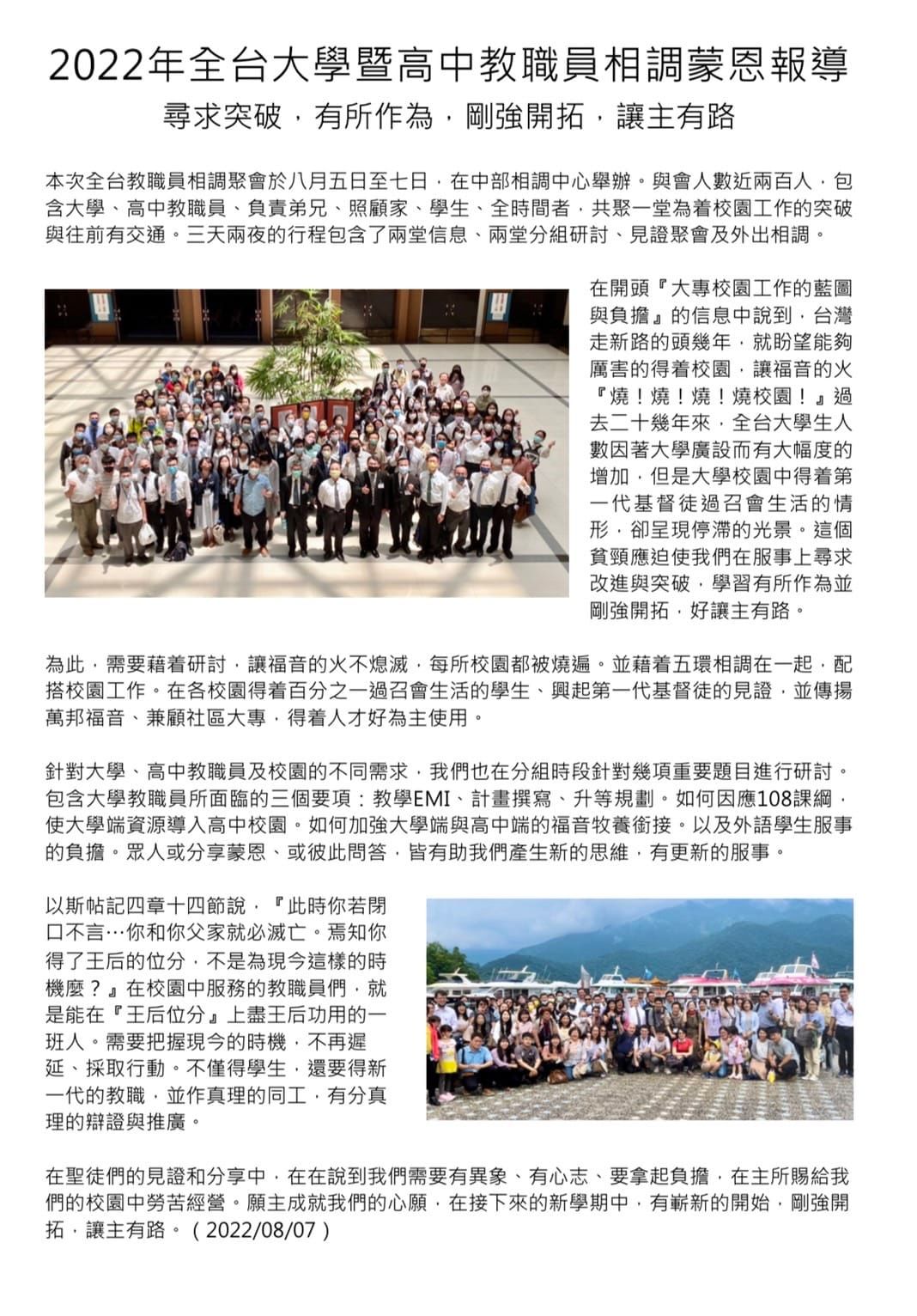 《2022年全台大学暨高中教职员相调蒙恩报导》—寻求突破,有所作为,刚强开拓,让主有路