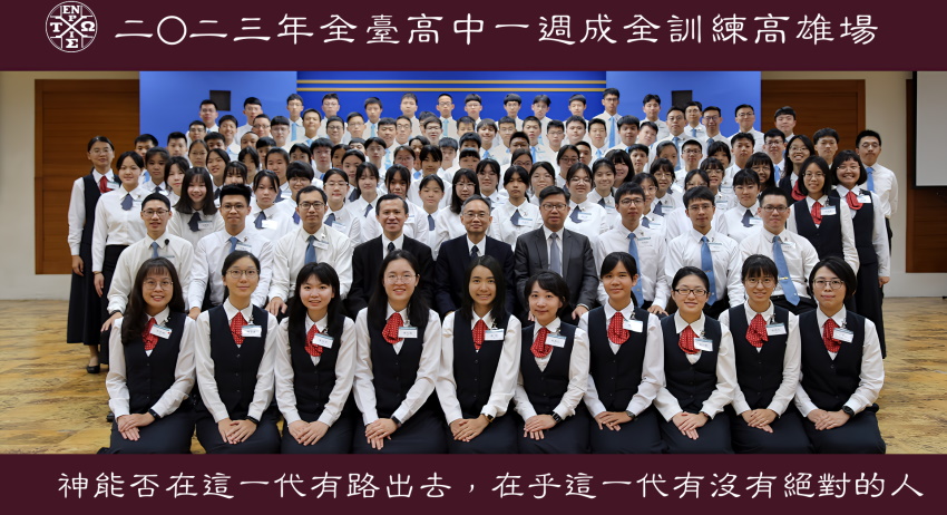 全台高中一周训练,于七月十六至二十二日在高雄新盛会所举行。来自全台六个城市八十六位青少年,经过至少两次服仪检查及面试,穿戴整齐的服装,在十九位辅训及十二位服事者的陪伴下,带着刚强的心志整装待发,豫备好接受一周七倍加强的成全。