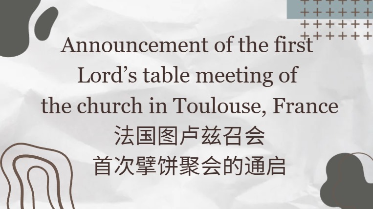 已发表 2025-10-05 Announcement of the first Lord’s table meeting of the church in Toulouse, France 法国图卢兹召会首次擘饼聚会的通启