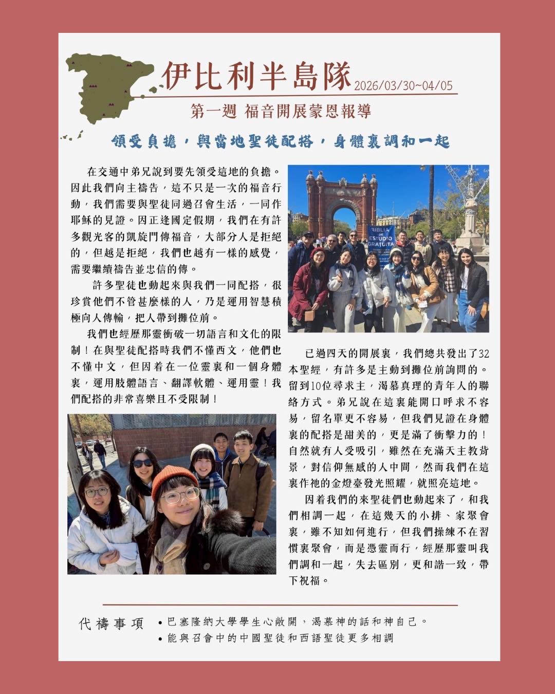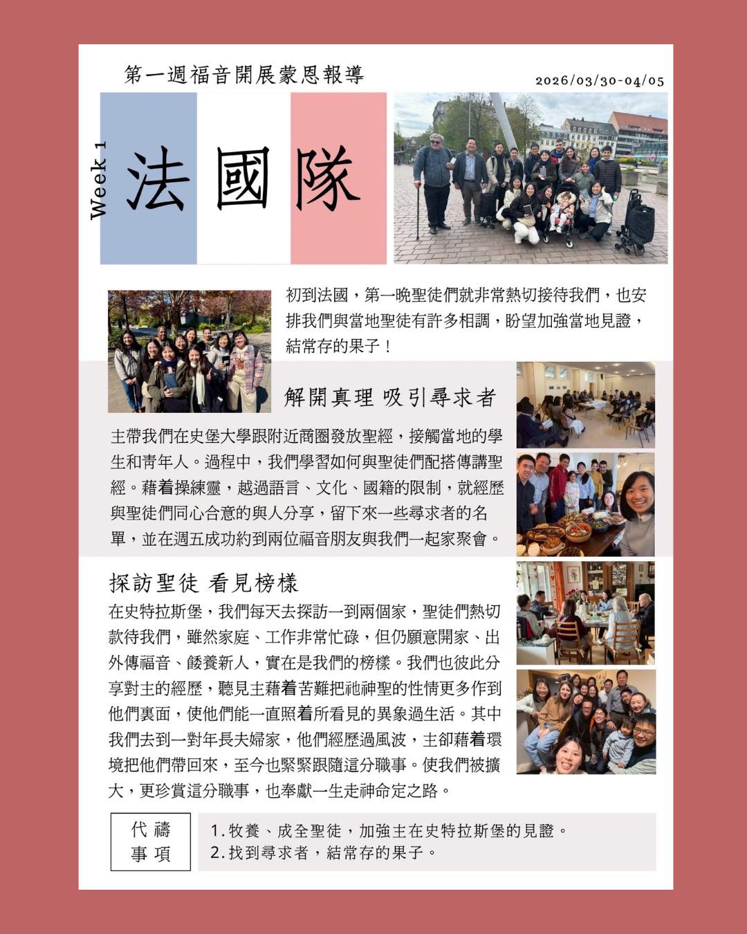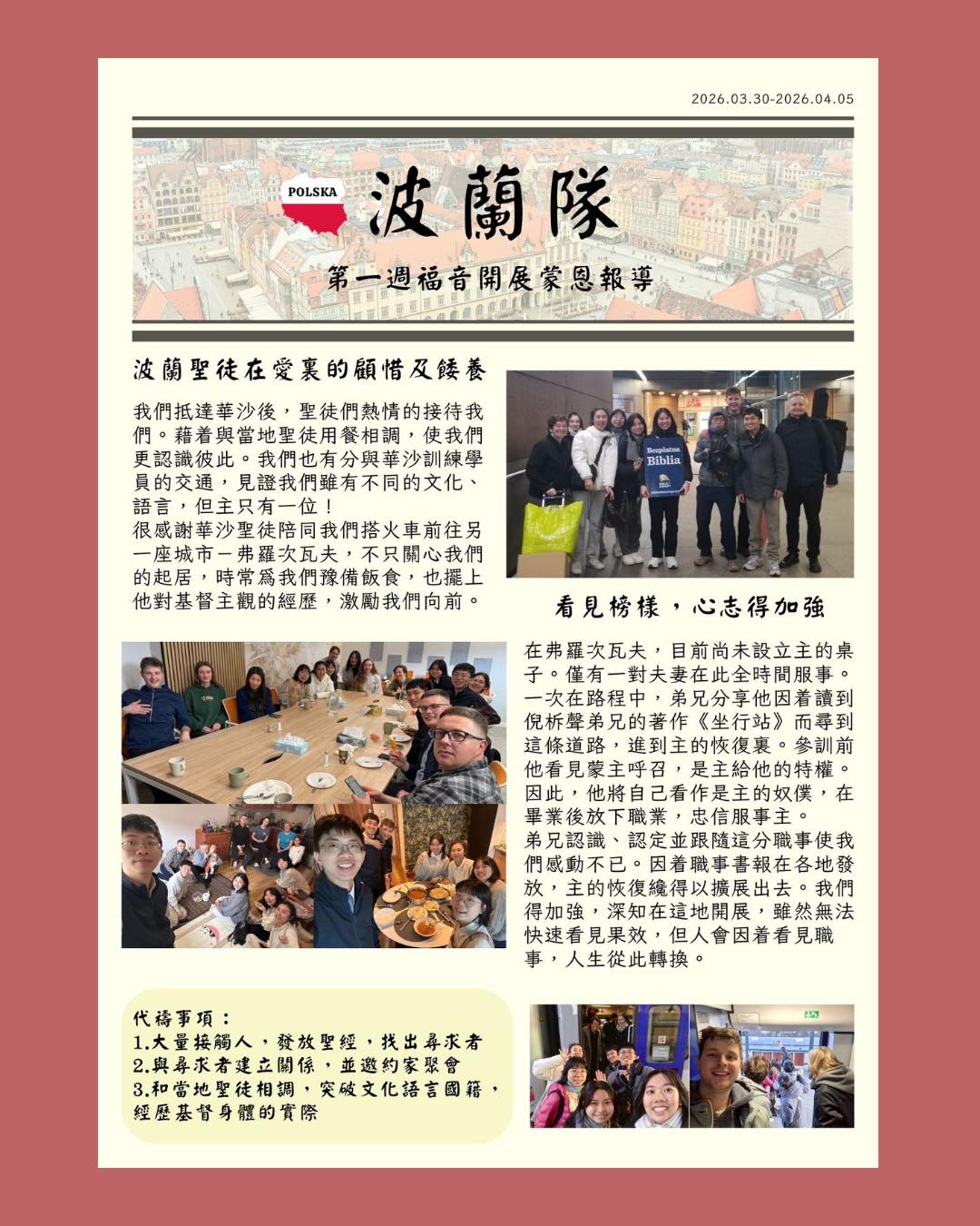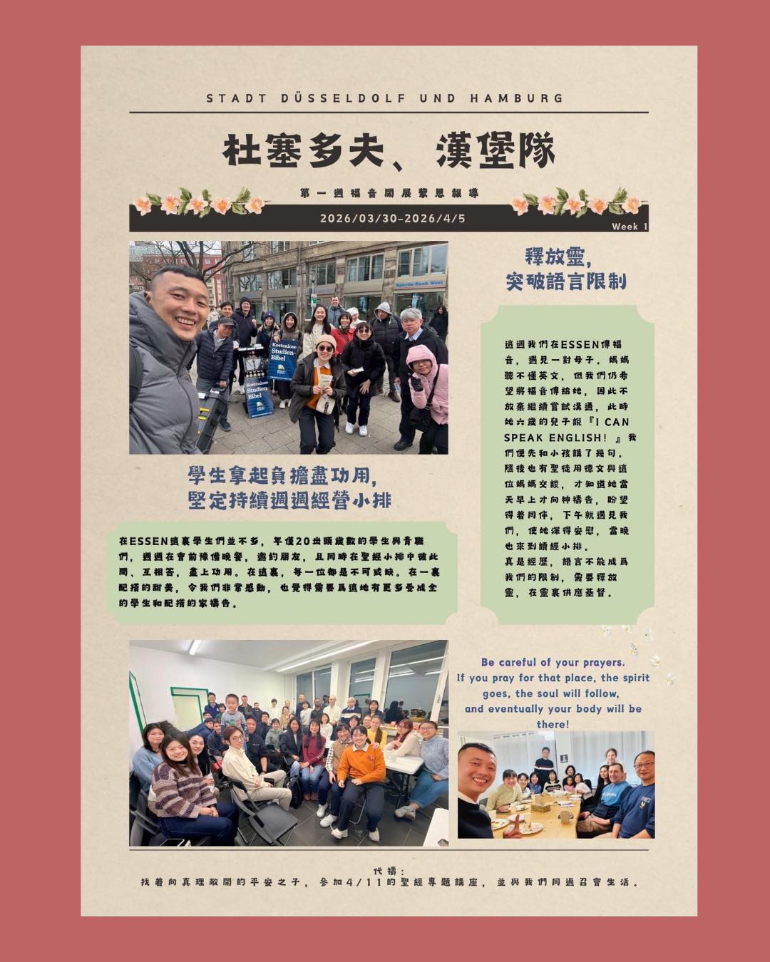 2026 Overseas Gospel Propagation Report Series 二〇二六年海外福音开展系列报道 已发表 2026-04-17 讚美主!本次海外開展共有14個開展隊,在全球各地傳揚福音。附圖爲第一週開展蒙恩報導(2026/03/30-2026/04/05) 德國:杜塞多夫、漢堡 西班牙、葡萄牙 英國:倫敦 愛爾蘭:都柏林、貝爾法斯特 希臘:雅典 波蘭:華沙、克拉克夫 法國:史特拉斯堡、羅恩 Resource:https://m.facebook.com/story.php?story_fbid=pfbid028vsKStRUvyM4iy8jaysxqtQMXshtR5W9ffS1ruuZmWywQDydC42xARcXWfk5bw4Gl&id=100064161096184&mibextid=wwXIfr