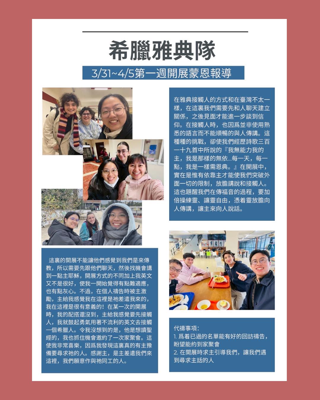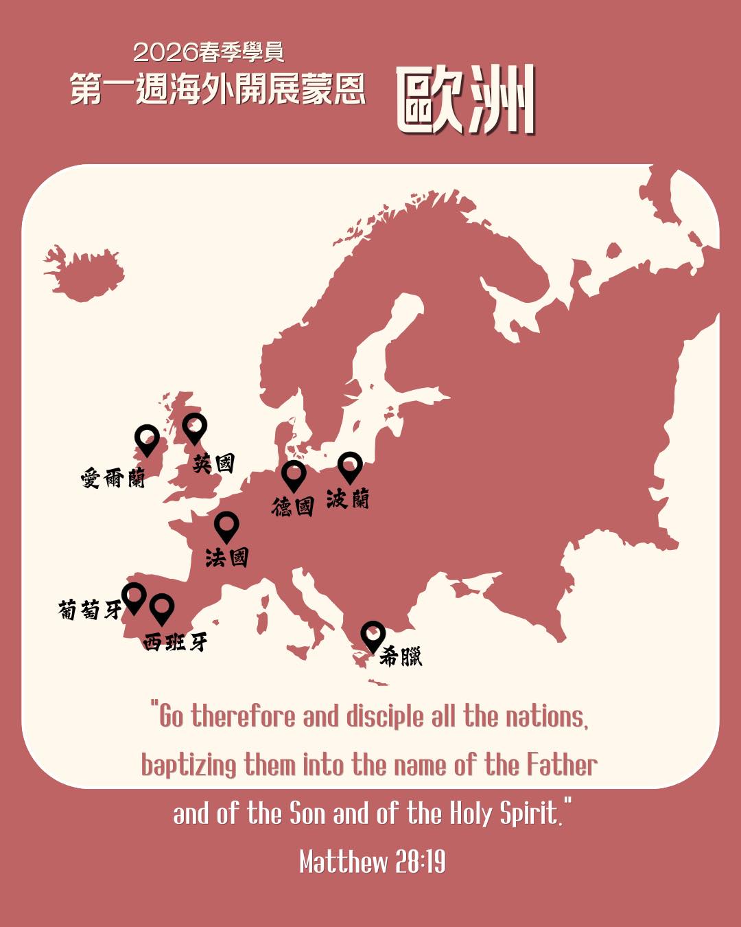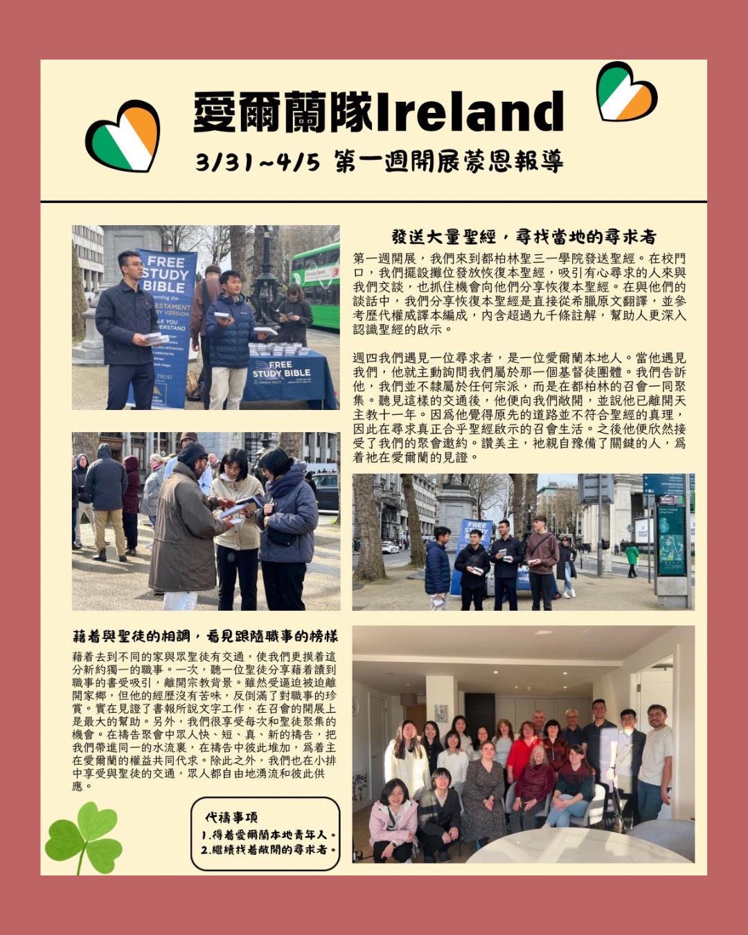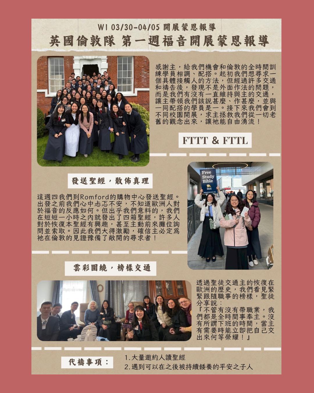 2026 Overseas Gospel Propagation Report Series 二〇二六年海外福音开展系列报道 已发表 2026-04-17 讚美主!本次海外開展共有14個開展隊,在全球各地傳揚福音。附圖爲第一週開展蒙恩報導(2026/03/30-2026/04/05) 德國:杜塞多夫、漢堡 西班牙、葡萄牙 英國:倫敦 愛爾蘭:都柏林、貝爾法斯特 希臘:雅典 波蘭:華沙、克拉克夫 法國:史特拉斯堡、羅恩 Resource:https://m.facebook.com/story.php?story_fbid=pfbid028vsKStRUvyM4iy8jaysxqtQMXshtR5W9ffS1ruuZmWywQDydC42xARcXWfk5bw4Gl&id=100064161096184&mibextid=wwXIfr